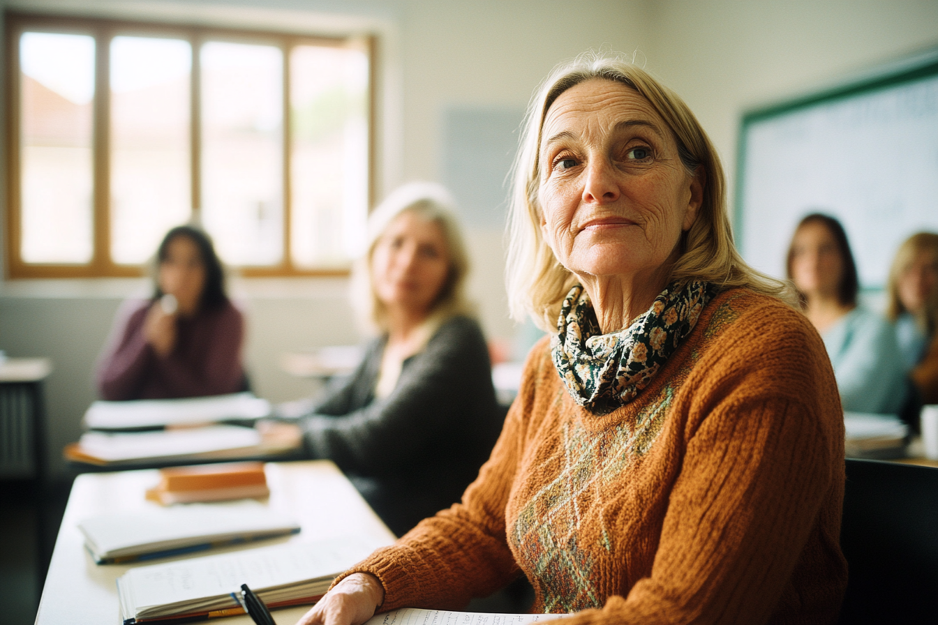 La imagen muestra un aula en la que varias mujeres asisten a una clase. En primer plano, una mujer mayor, que lleva un suéter naranja con un patrón de rombos y una bufanda con estampado floral, observa atentamente a la cámara. Su expresión muestra interés y serenidad, mientras su mirada se dirige ligeramente hacia un lado. En el fondo, hay más mujeres, algunas de las cuales están prestando atención, con un semblante concentrado. Las paredes del aula son de un color claro y hay ventanas grandes que permiten la entrada de luz natural, iluminando el espacio. En las mesas se pueden ver cuadernos y lápices, lo que indica un ambiente de aprendizaje activo. La escena refleja un sentido de camaradería y la búsqueda de conocimiento en un ambiente educativo.