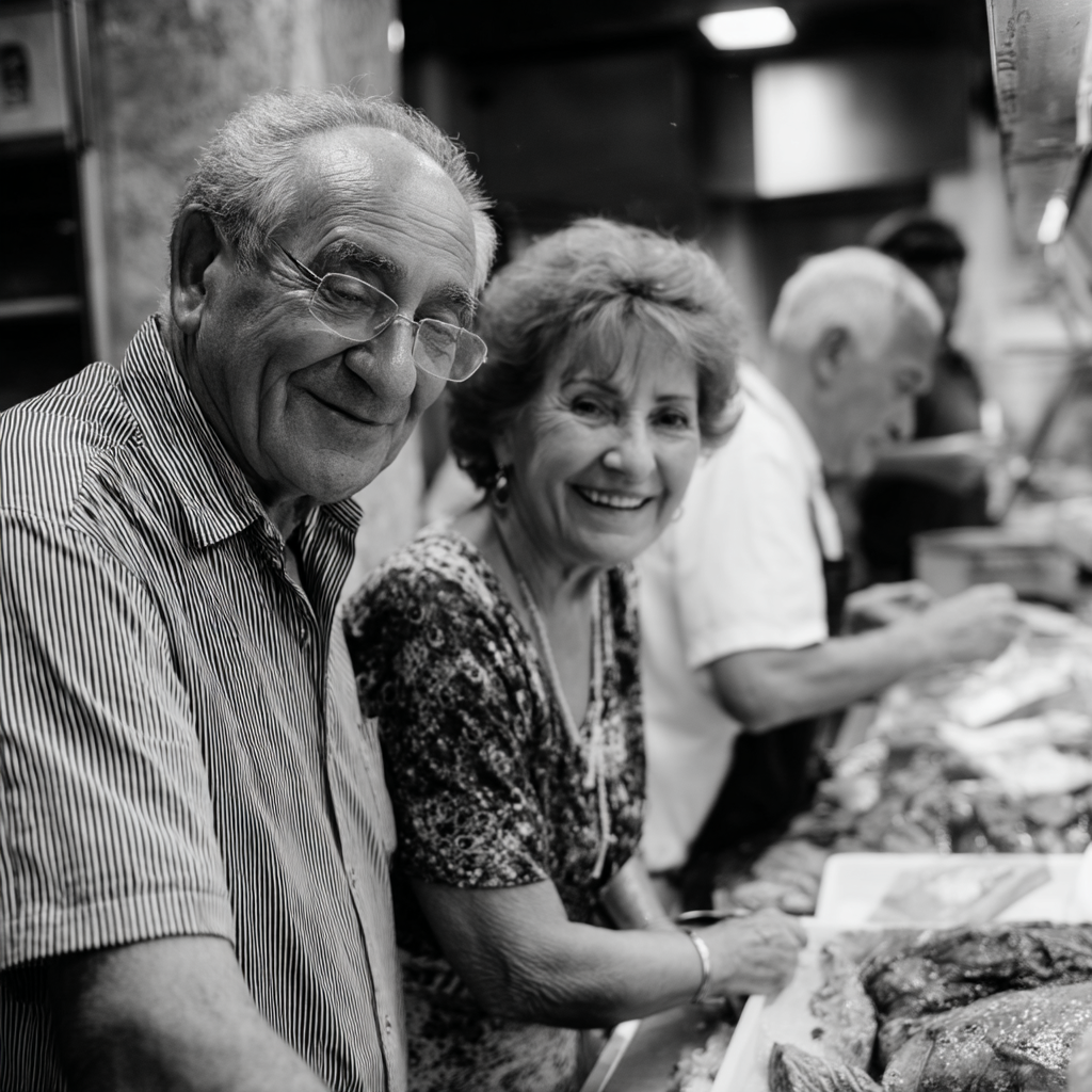 La imagen en blanco y negro captura un bullicioso mercado de pescado donde se pueden ver a dos personas mayores, un hombre y una mujer, disfrutando y sonriendo mientras posan entre exhibiciones de productos del mar. El hombre, con cabello canoso y gafas, muestra una expresión amigable, mientras que la mujer, de cabello rizado, también sonríe cálidamente. Ambos parecen estar disfrutando del momento, con un ambiente de camaradería y alegría en el aire. En el fondo, se pueden ver otros vendedores trabajando, lo que añade una sensación de actividad y vida al lugar. La elección del blanco y negro resalta la calidez de la escena y las texturas de los productos expuestos, así como la mirada afectuosa de las personas presentes.
