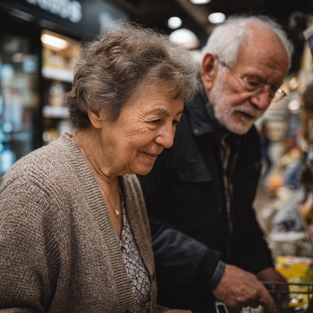 La imagen muestra a una pareja de personas mayores en un mercado o tienda de comestibles. La mujer, con cabello rizado y canoso, está de perfil, sonriendo suavemente mientras observa a su compañero. Lleva un suéter ligero de color beige y una blusa con un patrón floral. A su lado, el hombre, que tiene barba y también es canoso, parece estar cerca, concentrado en la compra que están realizando. Ambos parecen estar disfrutando de este momento juntos, mostrando una conexión cercana. El fondo está ligeramente desenfocado, pero se pueden ver estantes repletos de productos, sugiriendo un ambiente vibrante y acogedor de mercado.