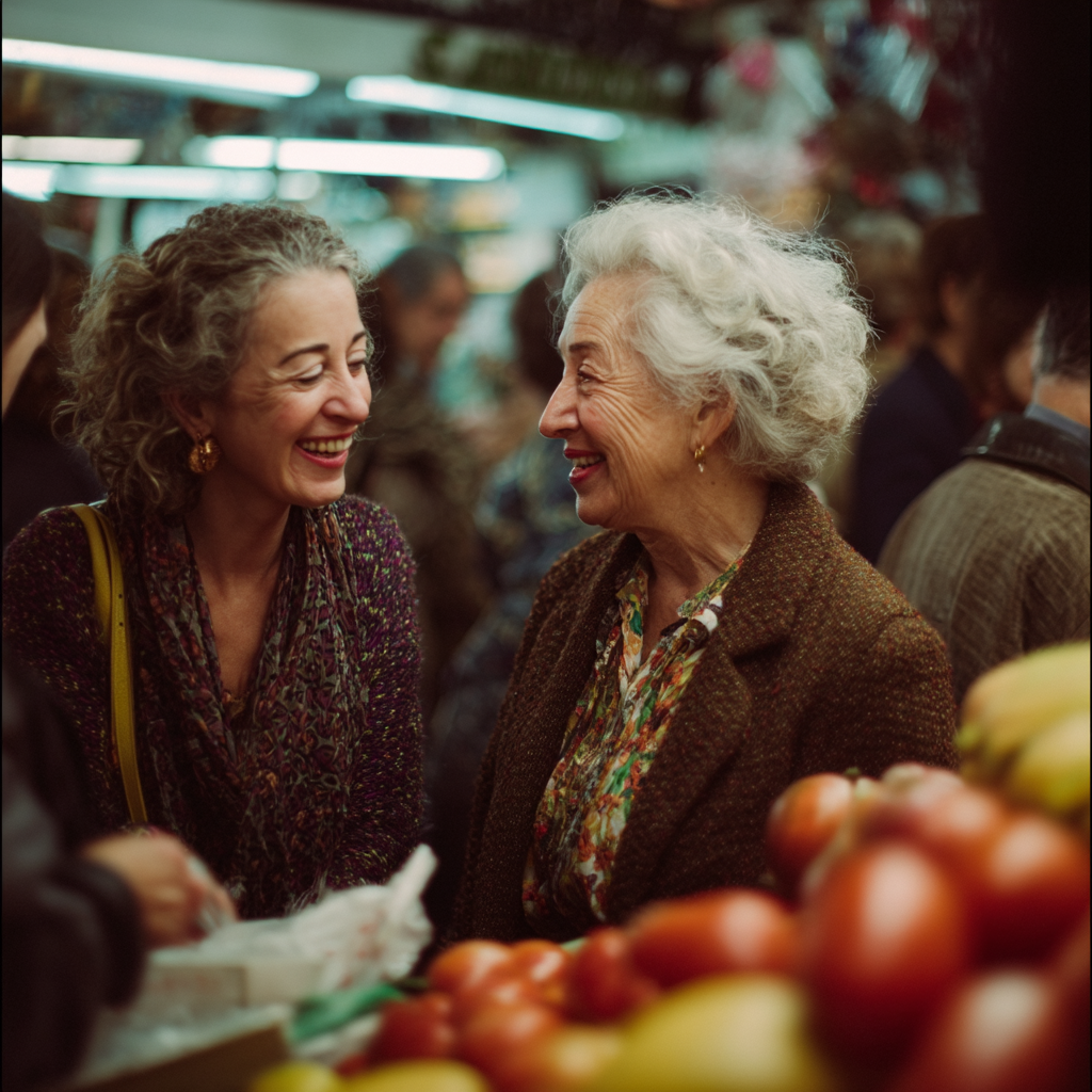 La imagen muestra a dos mujeres sonrientes en un mercado, rodeadas de un ambiente vibrante y bullicioso. A la izquierda, una mujer de cabello rizado y castaño, con un pañuelo de colores y pendientes dorados, se ríe mientras interactúa con una mujer mayor a su derecha. Esta última, con cabello canoso y rizado, lleva un abrigo marrón y parece disfrutar del momento. Ambas parecen estar conversando animadamente. En el primer plano, hay una variedad de frutas, incluyendo tomates y plátanos, que añaden color y frescura a la escena. El fondo está lleno de personas y luces difusas, lo que sugiere un mercado lleno de vida.