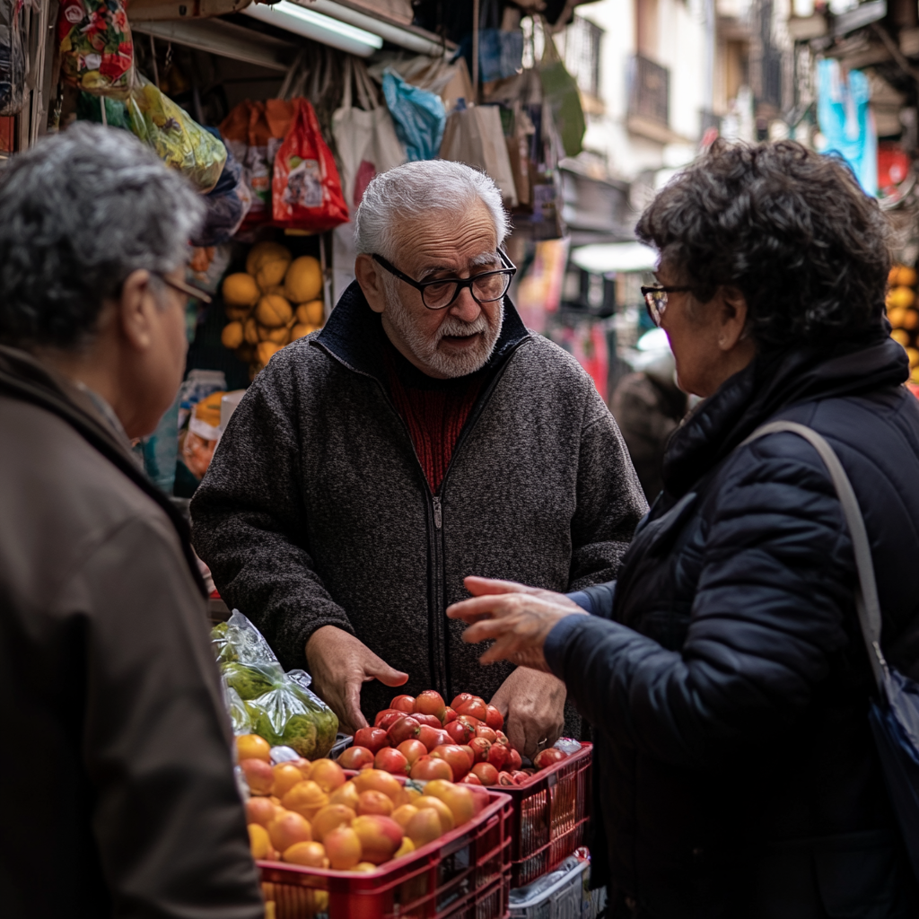 La imagen muestra un bullicioso mercado al aire libre donde un hombre mayor, con cabellos y barba canosos, conversa animadamente con dos mujeres. El hombre, vestido con un abrigo gris y un suéter oscuro, parece ser un vendedor o un comerciante, mientras que las mujeres, vestidas en abrigos oscuros, parecen interesadas en los productos. A su alrededor se pueden ver varios cestos de frutas y vegetales frescos, que incluyen tomates, duraznos y verduras, creando un ambiente vibrante y colorido. La escena transmite una sensación de comunidad y conexión, reflejando la cotidianidad de las interacciones en un mercado local. Los colores son cálidos y acogedores, con un enfoque en la frescura de los productos que se ofrecen.