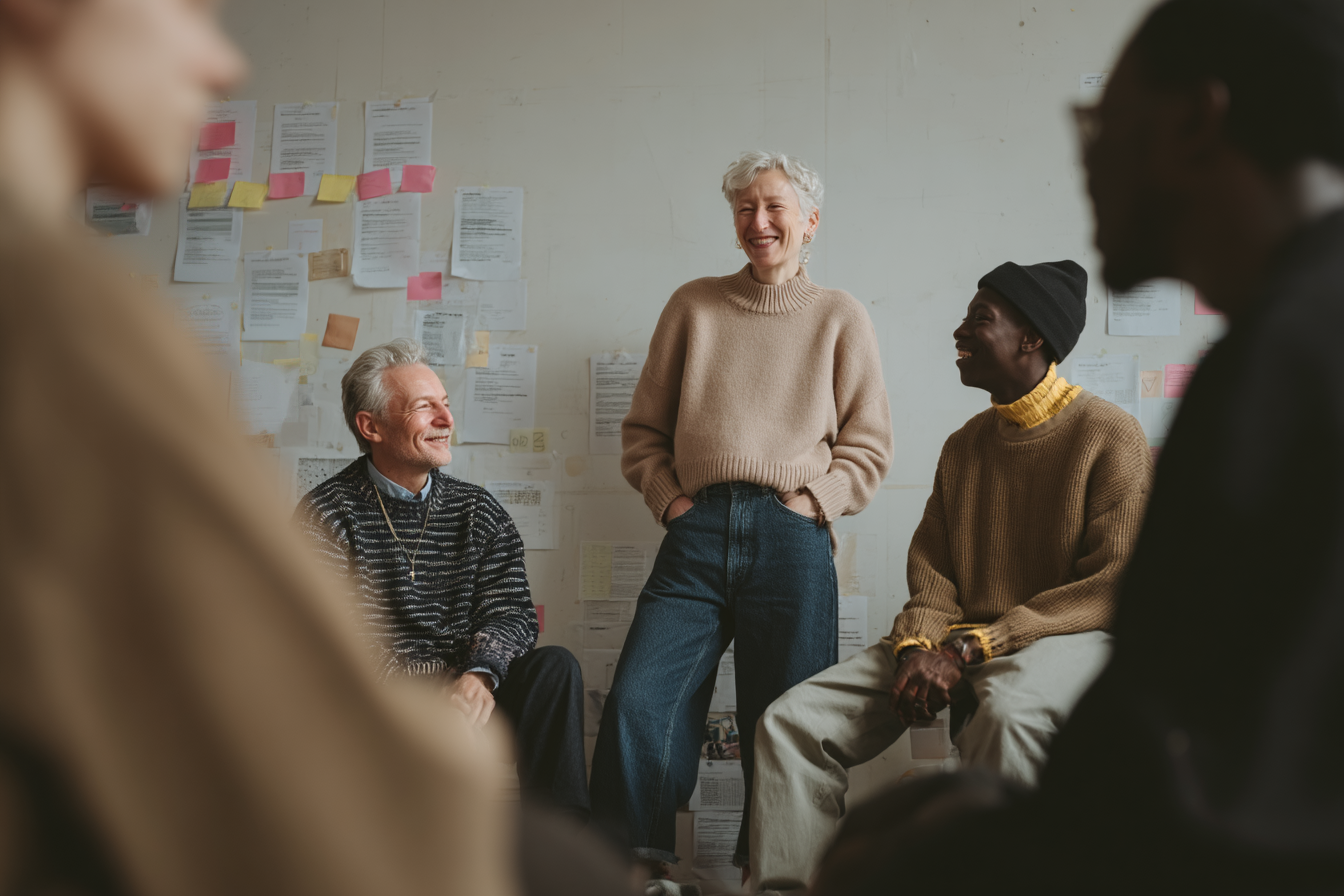 La imagen muestra a un grupo diverso de personas en un ambiente relajado y colaborativo. En el centro, una mujer de cabello corto y canoso sonríe mientras se apoya suavemente sobre sus caderas, vestida con un suéter beige y jeans. A su izquierda, un hombre mayor con cabello gris y un suéter de rayas también sonríe, mostrando un ambiente de camaradería. A la derecha, un hombre joven con piel oscura lleva un suéter beige y un gorro negro, luciendo alegre mientras interactúa con sus compañeros. La escena está enmarcada por una pared llena de papeles y post-it de colores, sugiriendo un entorno de trabajo creativo o un espacio de intercambio de ideas. La iluminación es suave y natural, creando una atmósfera acogedora y amigable.