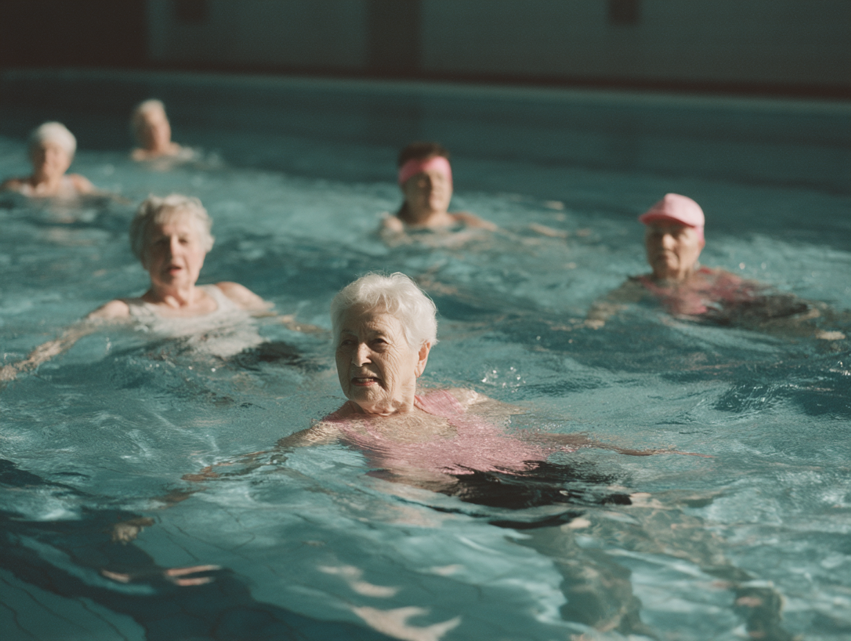 La imagen muestra a un grupo de mujeres mayores disfrutando del ejercicio en una piscina. Varias de ellas llevan trajes de baño claros y algunas tienen gorras para nadar. La protagonista en primer plano, de cabello canoso, sonríe mientras flota en el agua. La luz natural entra en la piscina, dándole un aspecto cálido y relajante. Al fondo, se pueden ver más mujeres en diferentes posiciones, algunas interactuando entre sí. El ambiente es de camaradería y vitalidad, resaltando la importancia de la actividad física en la vida de las personas mayores. El agua refleja la luz, creando un efecto visual atractivo y tranquilo.