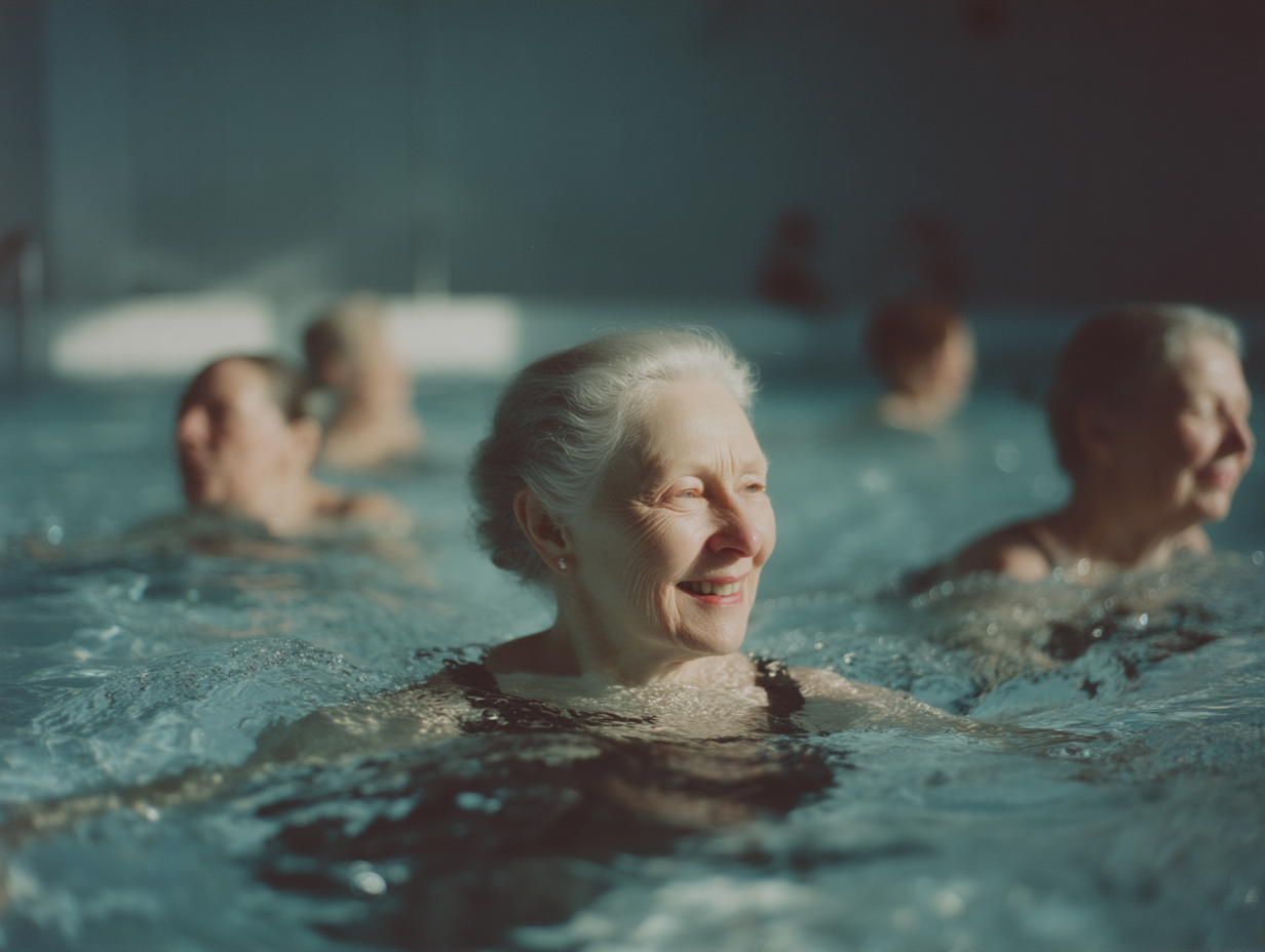 La imagen muestra a varias mujeres mayores en lo que parece ser una piscina, disfrutando de una sesión de natación o ejercicio acuático. En primer plano, una mujer con cabello canoso y sonrisa radiante destaca por su expresión alegre y relajada. El agua es de un azul claro y refleja la luz, creando un ambiente tranquilo. En el fondo, se pueden ver más mujeres que también están en el agua, algunas con el rostro parcialmente visible, lo que sugiere un ambiente social y de camaradería. La iluminación suave contribuye a la atmósfera pacífica de la escena. La piscina parece estar en un lugar cerrado, con detalles difusos en el fondo que no distraen del enfoque central en las mujeres.