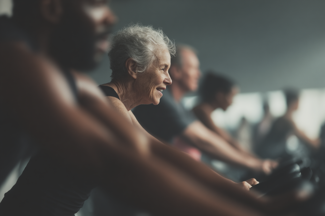 La imagen muestra un grupo diverso de personas en un entorno de ejercicio, posiblemente en una clase de ciclismo indoor. En primer plano, se observa a una mujer de edad avanzada que sonríe mientras pedalea, transmitiendo una sensación de entusiasmo y disfrute. A su lado, se pueden ver otras personas de diversas edades y contexturas, también concentradas en su actividad física. La atmósfera es dinámica y enérgica, con un fondo ligeramente desenfocado que sugiere un gimnasio bien iluminado. La expresión de la mujer sugiere que se siente motivada, reflejando una actitud positiva hacia el ejercicio. El uso de luces tenues y sombras acentúa la intensidad de la escena, destacando la importancia del bienestar y la actividad física en la vida de los participantes.