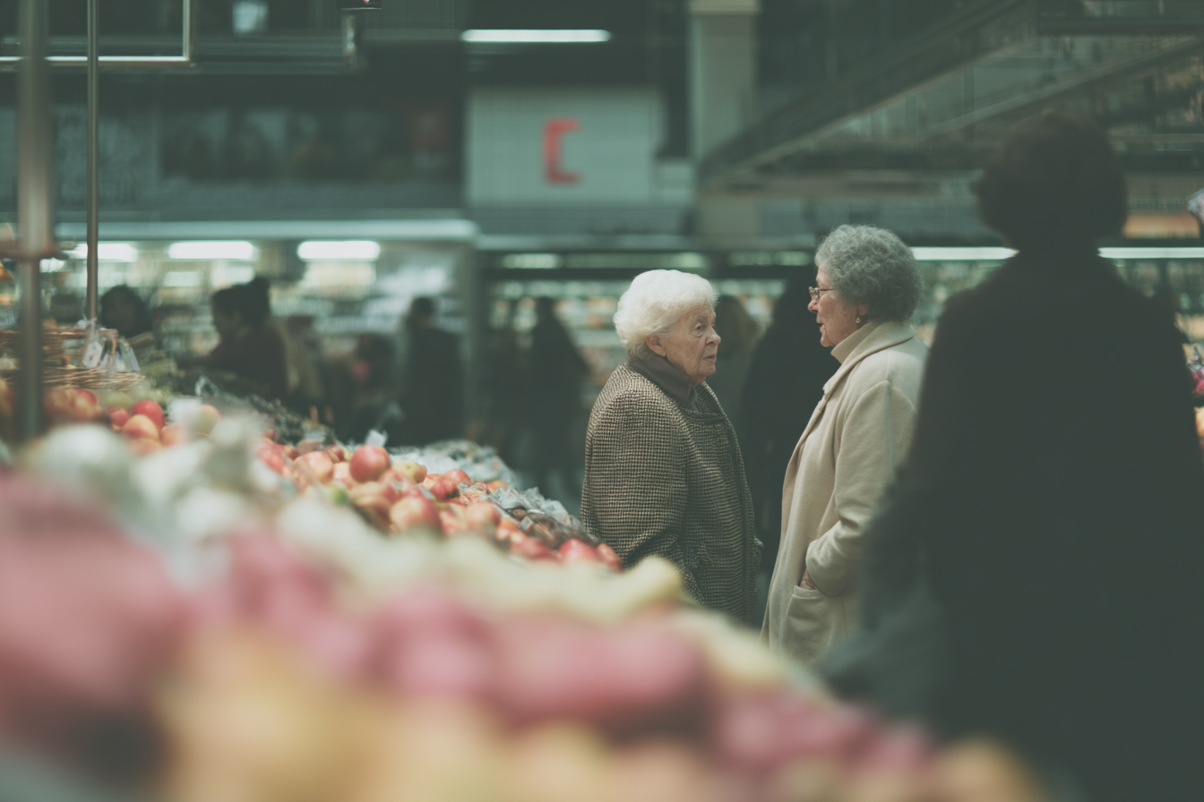 La imagen muestra a dos mujeres mayores conversando en un mercado. Ambas parecen estar entablando una amena charla, con expresiones amigables. La mujer a la izquierda tiene el cabello blanco y lleva un abrigo oscuro, mientras que la mujer a la derecha tiene el cabello rizado y viste un abrigo claro. En el primer plano, se pueden ver una variedad de frutas, particularmente manzanas en tonalidades rojizas y verdes, dispuestas en una mesa. El fondo es un ambiente de mercado animado, con otras personas que se mueven por los pasillos. La iluminación es suave y crea un ambiente cálido, lo que sugiere una atmósfera acogedora y urgente en el mercado.