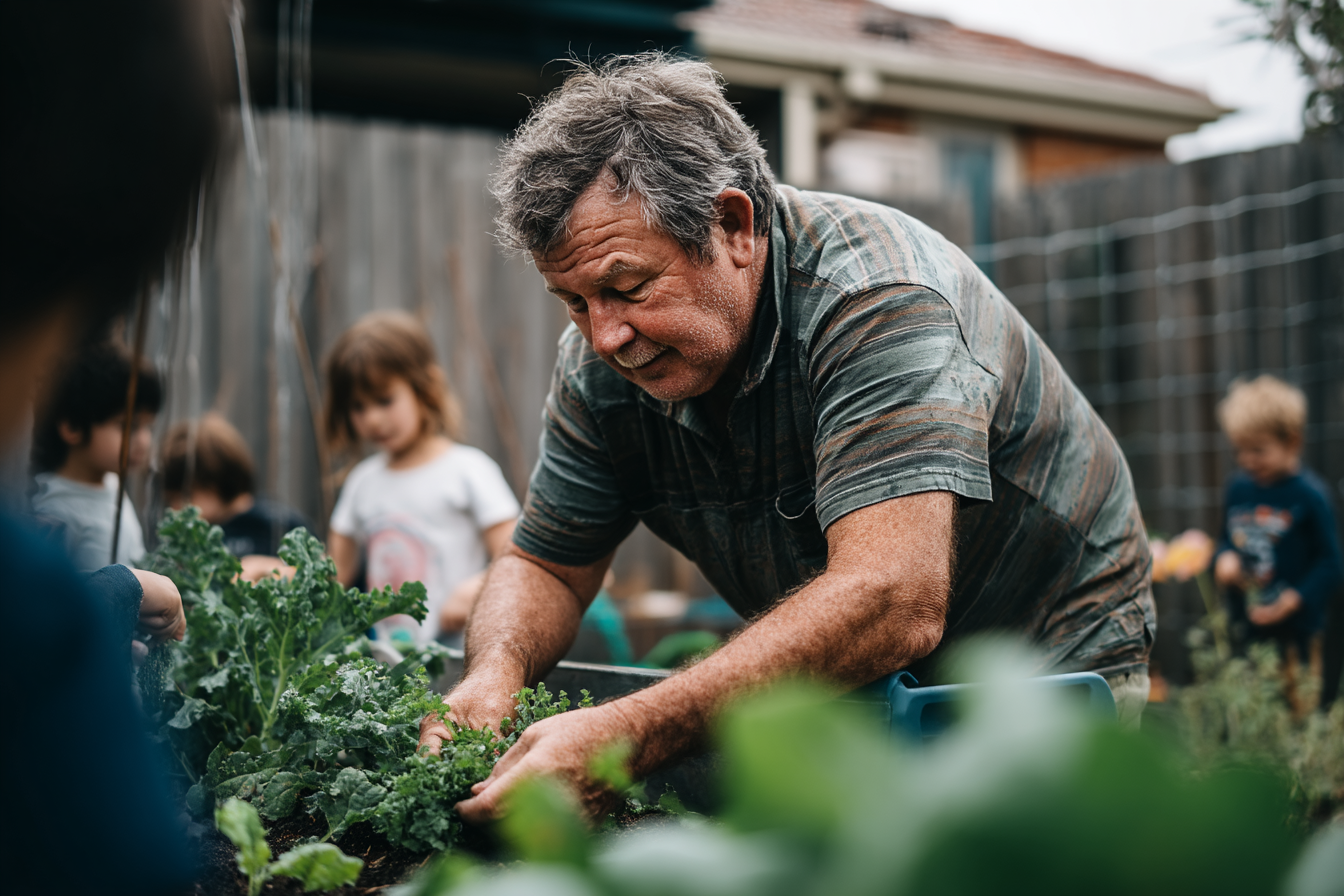 La imagen muestra a un hombre mayor, concentrado y de aspecto amistoso, trabajando en un jardín. Está arrodillado y cuidando de unas hojas verdes, posiblemente lechugas o col rizada, que crecen en la tierra. Su camisa de rayas coloridas sugiere una personalidad vibrante y enérgica. Al fondo, se pueden ver niños pequeños colaborando en el jardín, algunos de ellos parecen emocionados y están ocupados con otras plantas y actividades. El entorno es acogedor, con un cercado de madera y un cielo nublado que da una atmósfera de tranquilidad. La escena refleja un momento de conexión con la naturaleza y una experiencia de aprendizaje colaborativa entre generaciones.