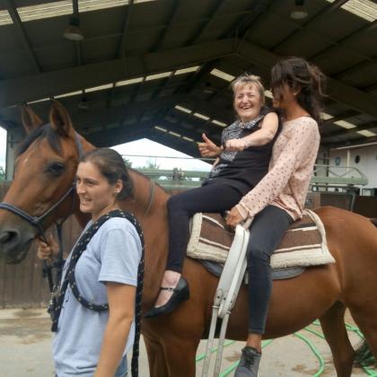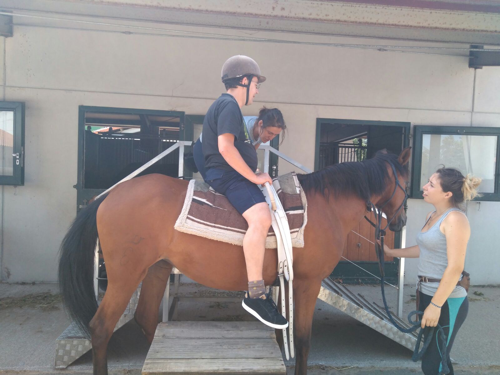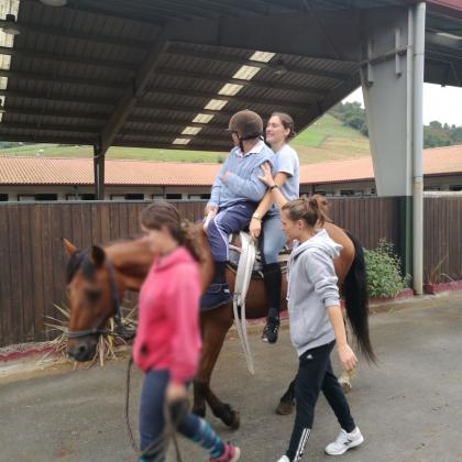 La primera salida la hicimos el 18 de julio y, desde entonces, cada martes un grupo de personas residentes de IZA va en taxi adaptado a la hípica Miracampos en Lasarte. Todos los participantes son acompañados por un grupo de trabajadores donde, a turnos, montan en una yegua preparada para este tipo de programas.