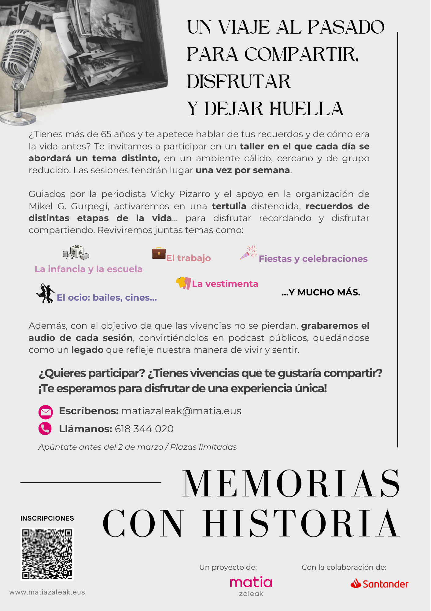 Es una iniciativa que empezará con unos talleres compuestos por personas mayores. Talleres y coloquios que irán guiados por una persona especialista, que irá activando recuerdos de su pasado, recuerdos de diferentes etapas de su vida, de cómo se vivía, sobre el trabajo, las celebraciones, la infancia... diferentes temáticas que recorren su vida y activan y refrescan sus recuerdos. El grupo participará en 10 talleres temáticos.