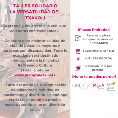 Este sábado 8 de Septiembre pudimos disfrutar y hacer un gesto solidario a la vez. El taller solidario sobre la versatilidad del txakoli organizado por Hiruzta Bodega y Lluch Wine & Gastronomy Marketing a favor...