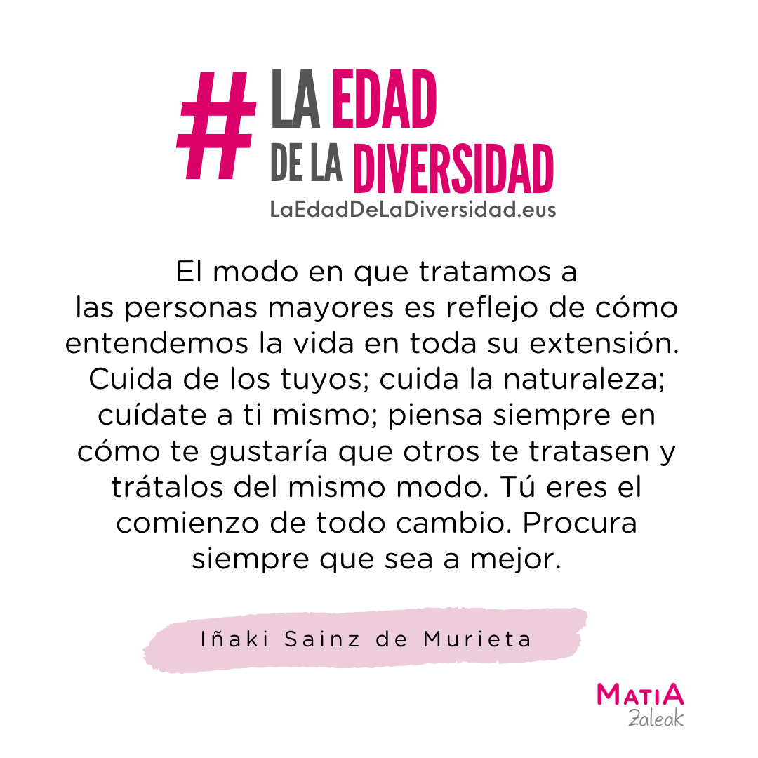 Har dezagun beste begirada bat, ispiluan begiratzen dugunean, aukeren etorkizuna ikus dezagun, gaitasunak sustatzen dituen eta pertsona guztien balioa ahazten ez duen gizarte batean, gazteak, helduak edo adinekoak izan. Horrek, zalantzarik gabe, pertsona gisa eta gizarte gisa hobeak egingo gaitu.
