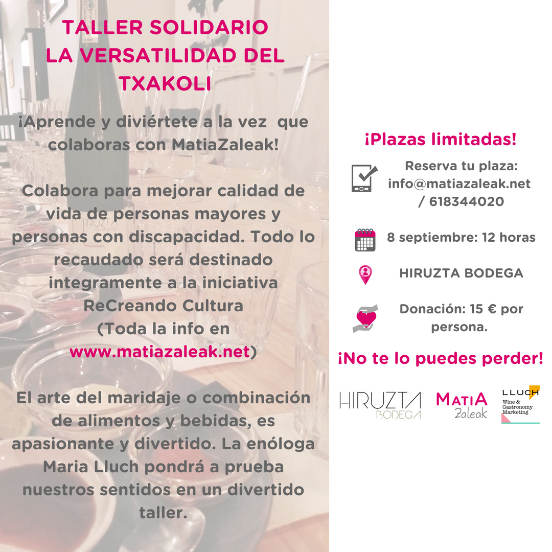 TAILER SOLIDARIOA - TXAKOLINAREN MOLDAKORTASUNA: Lluch Wine & Gastronomy eta Hiruztari esker, gaur, Irailaren 8a, tailer solidario bat egin dugu, non disfrutatu eta ikasi egin dugun txakolinaren moldakortasunaren inguruan. Hiruztan etxean bezala egon gara, upategira bisita eta historiaren errepasoa egina. ETa MAria Lluchen eskutik disfrutatu eta barre egin dugu, eta noski, ikasi. Partehartzaile guztiei esker... 26... 405 € bildu ditugu... beraz.... LORTUTA!!!!!!