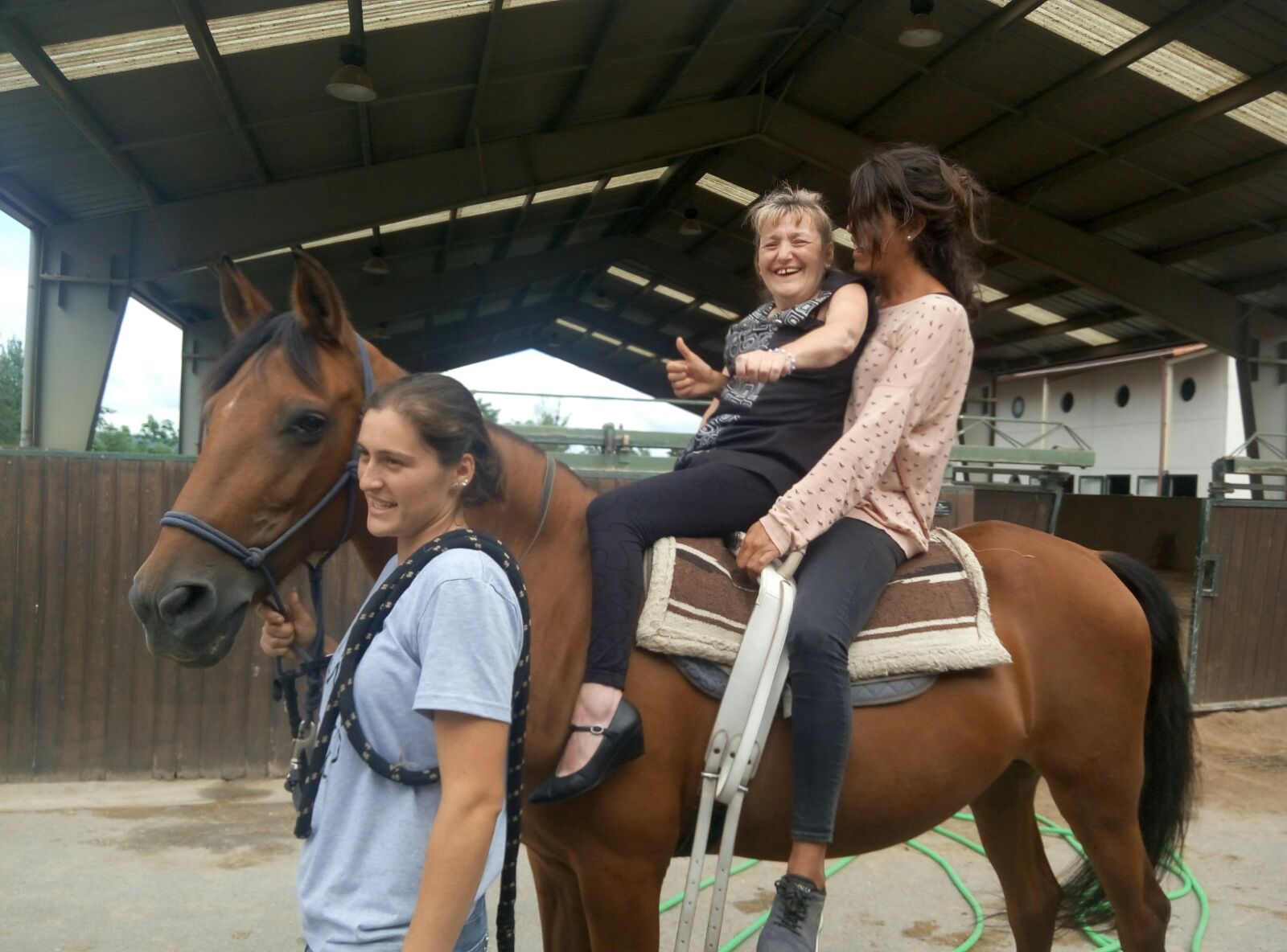 Hori guztia burutzeko, astean behin taxi egokituan joaten gara zalditegi batera. Ekinoterapeuta baten eta IZA zentroko langileen laguntzari esker, gure zentroko pertsona batzuk (desgaitasun fisikoa eta lotutako patologiak dituztenak) zaldi gainean ibiltzen dira.