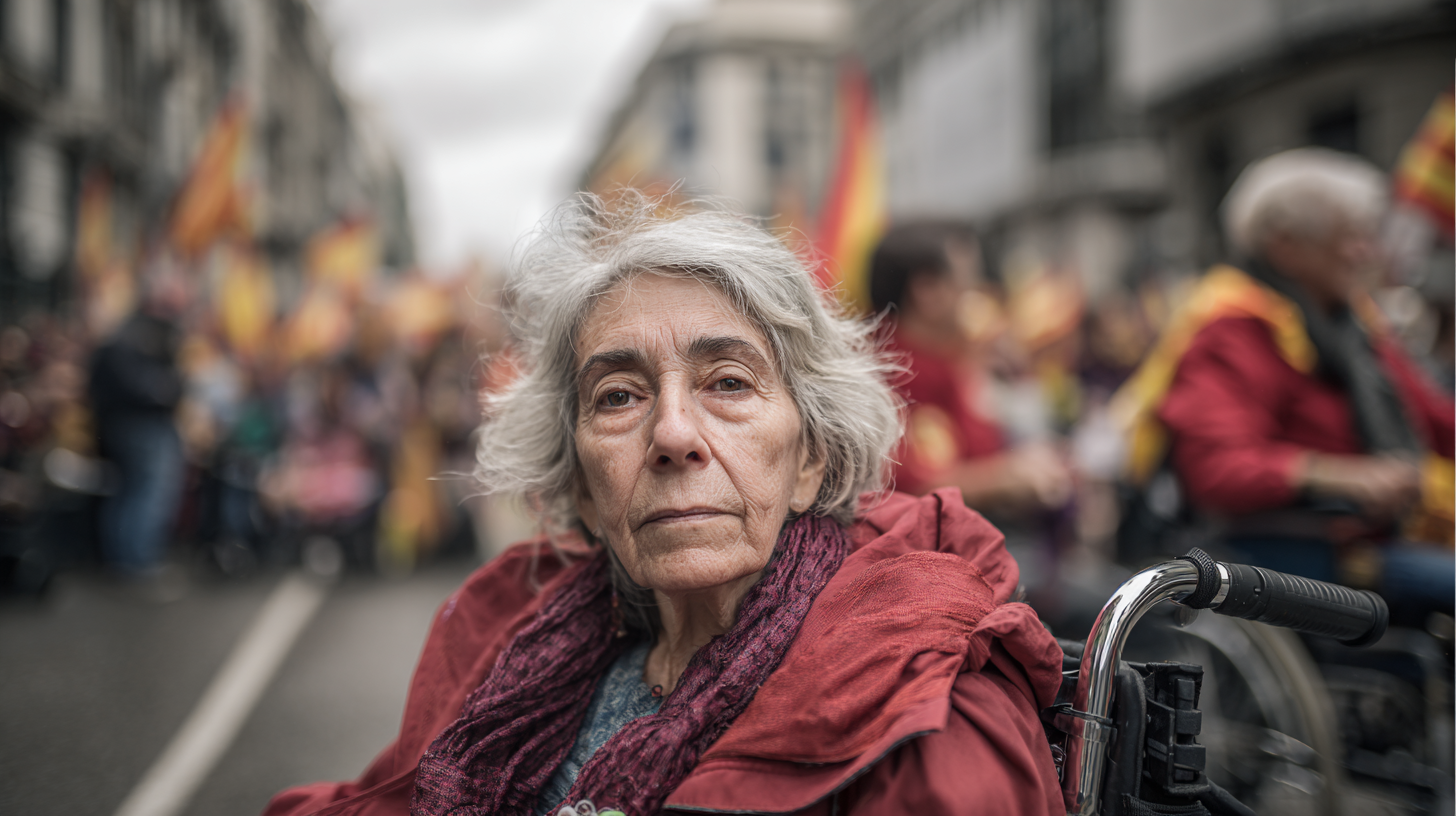 Irudiak adineko emakume bat aurkezten du, ile grisezkoa duena, eta aulki guter batean dago. Bere adierazpena serioa eta kontemplatiboa da, pentsamendu sakon bat edo determinazio sentimendu bat iradokitzen du. Gorri koloreko kapel bat eta lepoa berotzeko txal bat jantzita du. Atzean, jende multzo bat ikusten da manifestazio batean parte hartzen, horietako askok koloreko ikurrak eusten dituzte, protesta edo ospakizun giro bat adieraziz. Atmosfera gizarte aktibitatez beteta dago, emakumeak iragana eta gaur egungo borroka lotzen dituen pertsona gisa nabarmentzen duelarik. Argiztapena leuna da, tonu melankoliko eta pentsakor bat emanez. Konposizioak emakumean arreta jartzen du, manifestazioaren testua pixka bat lausotuz, ekitaldian bere indibiduitatea nabarmentzen du.