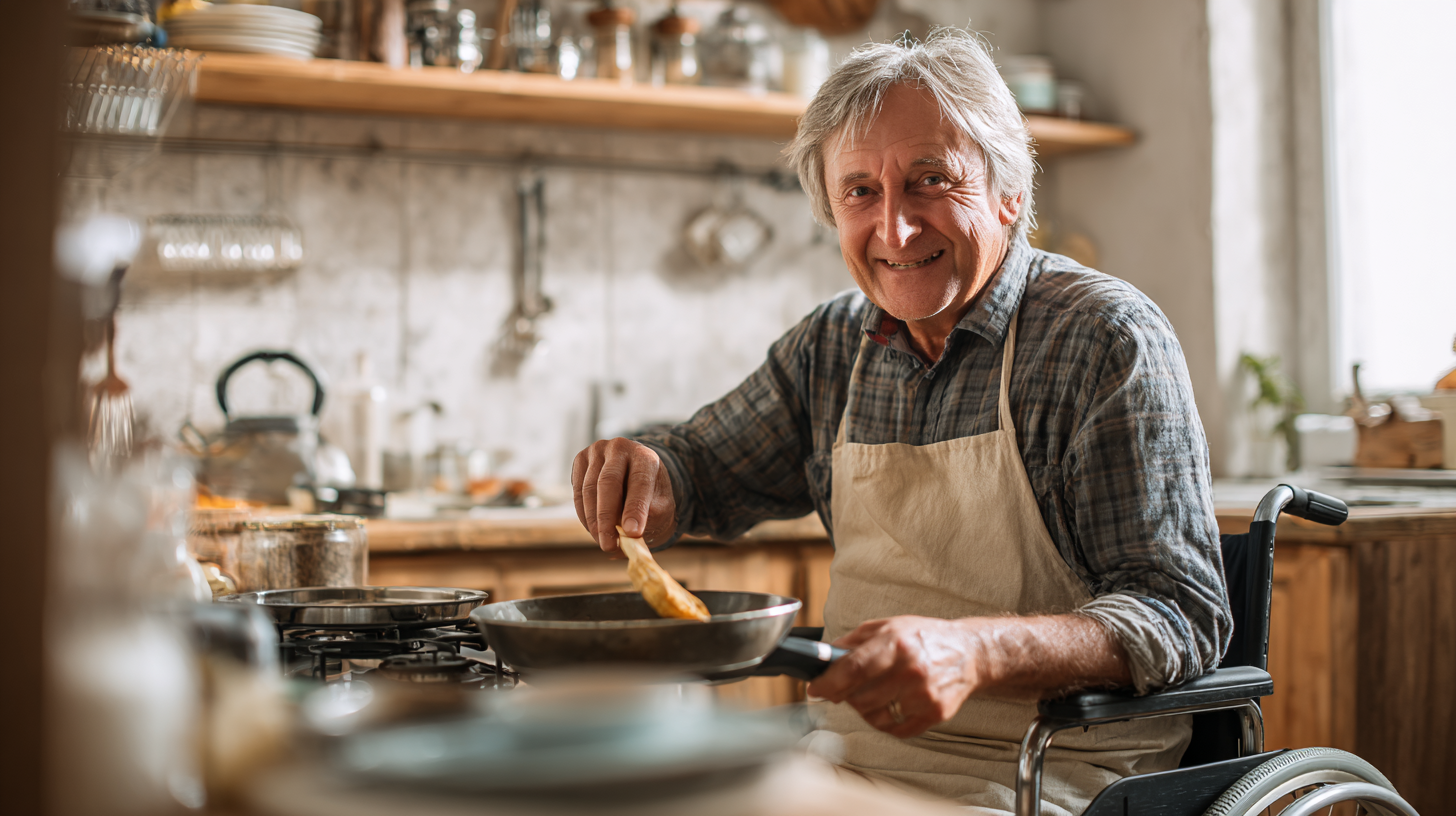 gizonezko zaharra, sukaldea, gurpil-katea, sukaldatu, zoriontasuna, adeitsua, bizimodu, sukaldeko pasioa, irribarrea, etxea.
