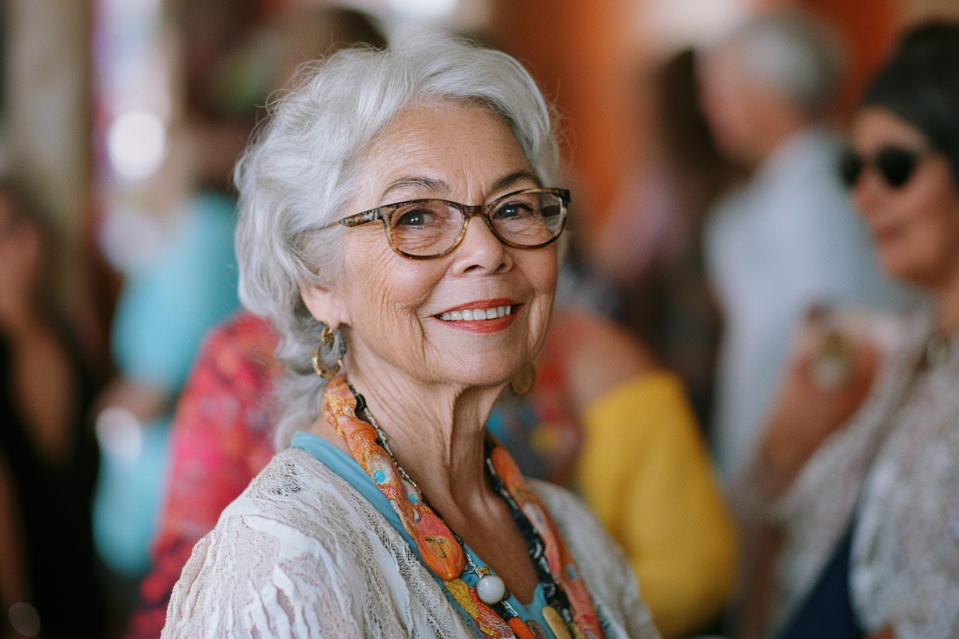 Irudiak ile kizkur eta urdindun emakume nagusi bat erakusten du, betaurreko meheak daramatzana. Irribarre atsegina eta beroa du, goxotasuna eta hurbiltasuna adieraziz. Arropa artean jertse zuri bat eta lepoko koloretsu bat daramatza, bere nortasun biziari distira emanez. Atzean jende multzo lausotua ikus daiteke, ekitaldi edo bilera sozial batean egon daitekeela iradokiz. Lepokoaren kolore biziak azalaren eta ilearen kolore leunekin kontrastea egiten dute, eta argiztapen leunak giro goxoa eta lagunartekoa sortzen du.
