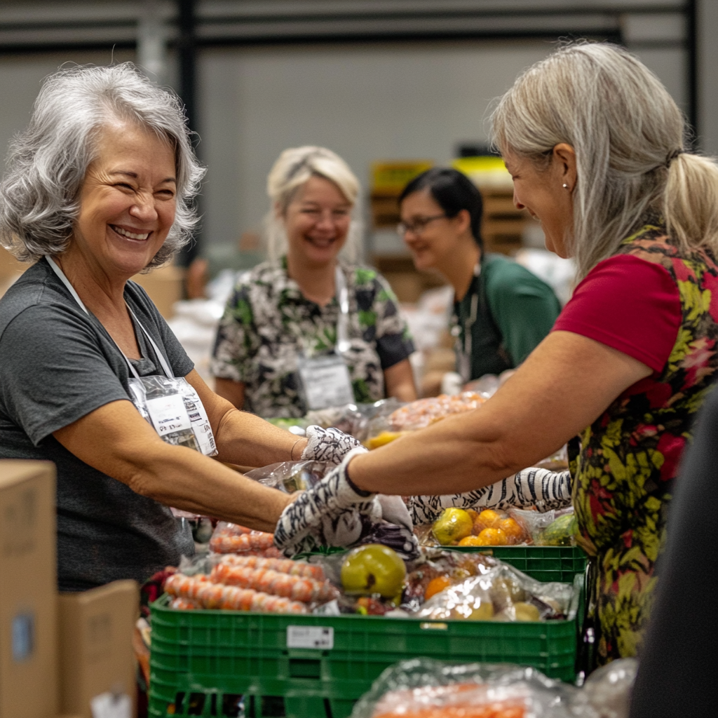 Irudiak boluntariotza-ingurune batean gertatzen den une bat erakusten du, emakume batzuk elikagaiak banatzeko lanean ari direlarik. Lehen planoan, bi emakume elkarri irribarre eginez ageri dira elikagaiak trukatzen. Ile kizkur griseko emakumeak, kamiseta beltzarekin, irribarre zabala erakusten du, poza eta adiskidetasuna islatuz. Beste emakumeak, ile luze eta lisoarekin, lore-estanpadun soineko bat darama eta irribarre egiten du jardueran parte hartuz. Atzean, beste emakume batzuk behatzen ari dira eta giroaz gozatzen dutela dirudi. Mahai gainean barazki eta fruta kutxa eta saski ugari daude, gosearen aurkako lan kolektiboa irudikatuz. Argiztapen naturalak espazioa argitzen du, giro bero eta atsegina sortuz.