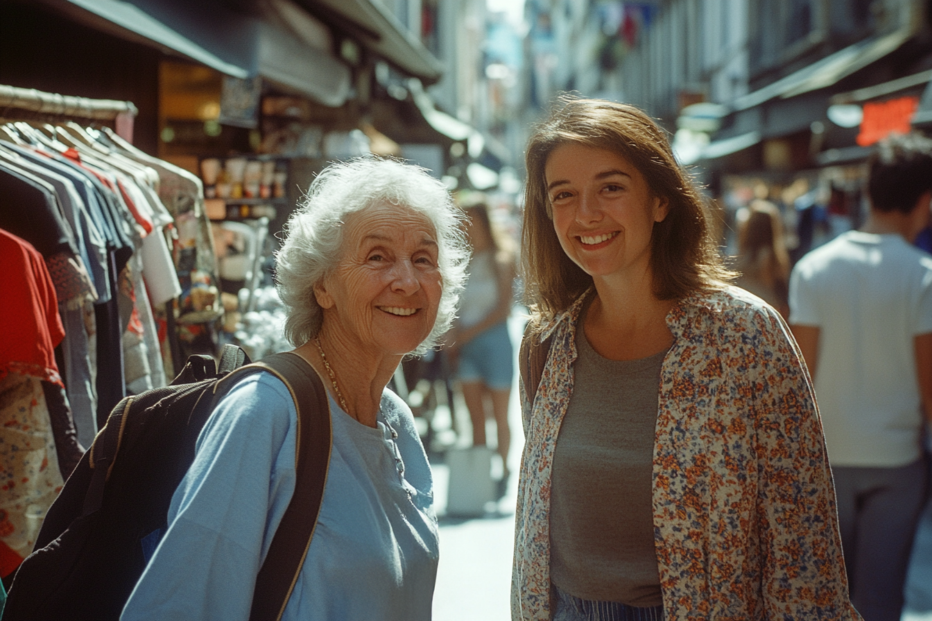Irudiak aire libreko azoka batean irribarrez ari diren bi emakume erakusten ditu. Ezkerrean, ile kizkur eta urdindun emakume nagusi bat ikus daiteke, mahuka luzeko kamiseta urdin bat eta poltsa iluna daramatza. Bere aurpegiko adierazpenak poza eta goxotasuna erakusten du. Eskuinean, ile kastainadun emakume gazteago bat dago, kamiseta grisa eta lore-estanpazko alkandora bat jantzita. Biak erdigunean daude, aurpegien adierazpenean arreta jarrita. Atzean, jendez betetako pasabidea eta jantziak dituzten denda-postuak ikus daitezke. Eguzki-argiak eszena argitzen du eta kolorez betetako giro alaia eta kulturala iradokitzen du.