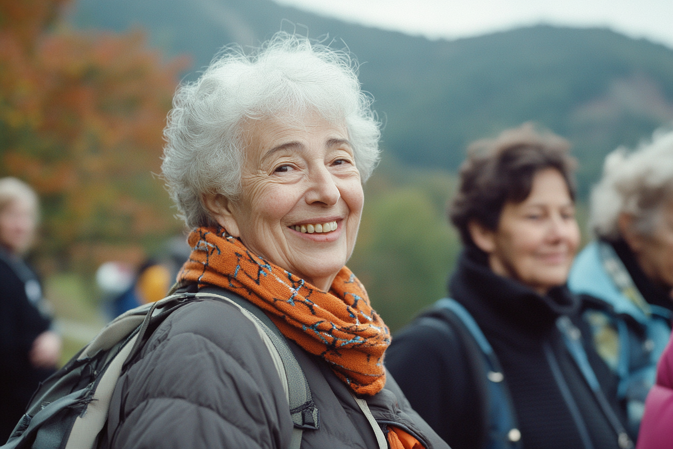 Irudiak aire libreko jende-talde bat erakusten du, lehen planoan ile kizkur eta urdindun emakume bat nabarmentzen delarik, irribarre zabala eta poza adierazten dituen espresioarekin. Jaka gris bat, abrigo marroi bat eta tonu epeldun bufanda bat daramatza, aurpegia nabarmentzen duten osagarriak. Atzealdean, beste aurpegi batzuk ikus daitezke, konpainiaz gozatzen ari direnak, eta paisaia menditsua ikus daiteke, giro natural bat emanez. Inguruko koloreek udazkeneko sasoia islatzen dute, berde, laranja eta marroi tonuekin, eta giro beroa eta atsegina sortzen dute.