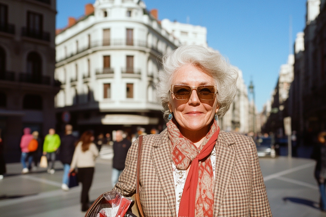 Irudiak ile kizkur eta urdindun emakume nagusi bat erakusten du, eguzkitako betaurrekoak eta irribarre atsegina dituela. Abrigo laukiduna darama eta lepoan zapia gorri bat du, jantziari kolore ukitu bat emanez. Atzealdean, kale bizia ikus daiteke, arkitektura klasikoa duten eraikinekin eta kalean ibiltzen diren pertsonekin, giro bizi eta dinamikoa sortuz. Eguzki-argiak eszena argitzen du, itzal eta argi guneen arteko kontrastea sortuz. Emakumea momentua gozatzen ari dela dirudi, irudiaren erdian konfiantzaz jarrera hartuta. Zerua urdin argia da, lasaitasun eta freskotasun sentsazioa emanez.