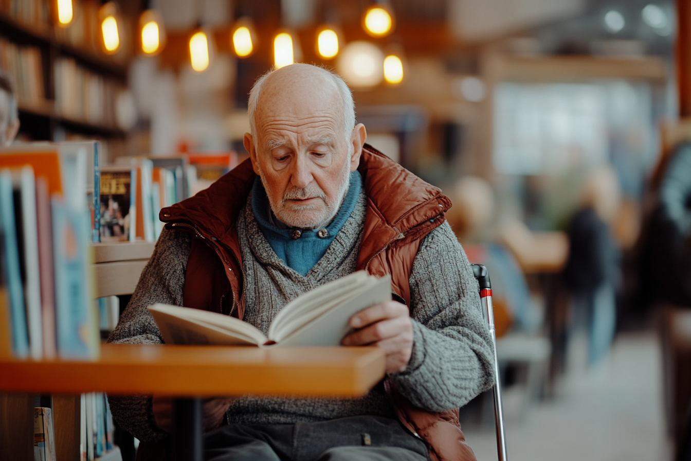 Irudiak gizon zaharr bat erakusten du, atseden hartuta inguru atsegina batean, seguraski liburutegi edo liburutegi bat izanik. Liburu batean zentratua dago, eskuetan duen eskuin interes eta hausnarketa aurpegian. Arropa marroi bat eta soineko grisa dauzka, freskotasun leku batean egon arazten duela esaten duena. Bere alboan, liburua jarrita dagoen egur mahai bat dago, eta bere alboan bastoi bat ikus daiteke, zailtasun bat izan dezakeela esan nahi duena. Atzekaldean, liburu askoz beteriko eta argi bizi askok sortzen duten atmosfera lasai eta lasai bat ikusten da. Batzuk, komunitate sentimendu bat gehitzen dute, irudi ilunetan ageri direnak, irakurketa espazio honetan.