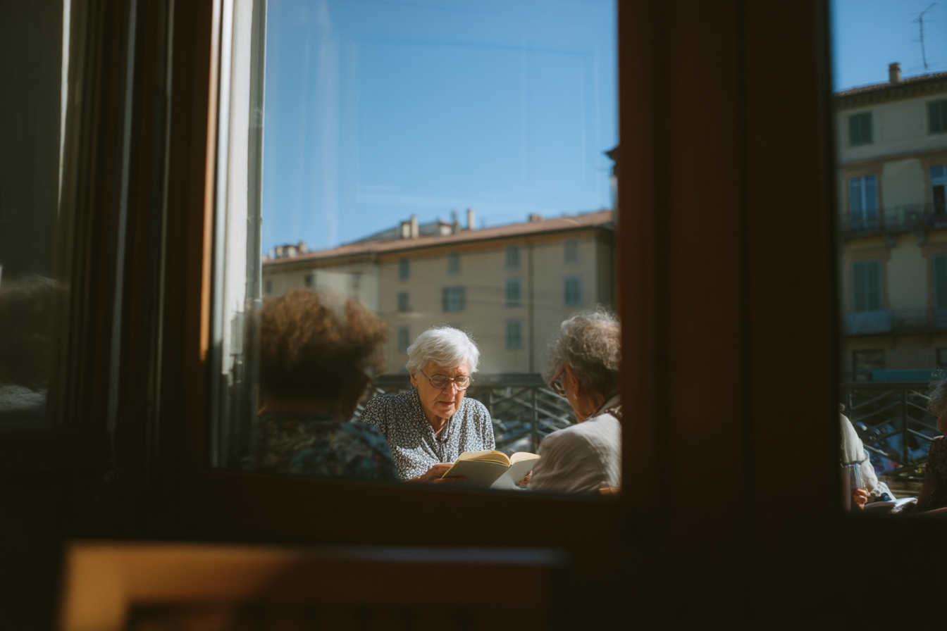 Irudia momentu sozial epel bat harrapatzen du, kafe antzokian mahai bat inguruan eseri diren pertsona zaharrak ikusten ditu. Leiho baten bidez, ile zuri eta betaurreko emakume bat ikusten da, liburu bat eskuan duela, agian irakurtzen ari den edo bere edukiak besteekin partekatzen. Eguzkiaren argia ingurua argitzen du, itzal leunak sortuz eta egunaren epelkeria nabarmentzen. Atzean, estilo klasiko bat duten eraikin batzuk bereiz daitezke, hiri ingurunea irudikatuz. Argazkiaren zentroa batez ere irakurle emakumean jarria dago, taldeko beste kideak desenfokatuagoak dira, intimitate eta elkargunea adierazten duten moduan. Bidaiak eta eguneroko bizitza uztartzen dira irudian honetan, irakurketa eta elkarrizketa elementu zentraletan.