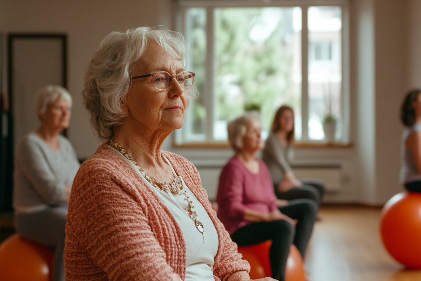 Irudiak adin ezberdinetako emakume talde bat erakusten du, nagusiki zahar adinekoak, argi natural batez inguraturiko areto batean. Aurrean, emakume zahar batek bere aurpegia lasai eta kontemplatiboan nabarmendu, ile grizaldua eta jertse argia duena. Galtza dauka eta atsedeneko kolarra, bere jantziarekin bat egiten duena. Haren atzean, beste emakume batzuk gimnasio pilotei gainean eserita daude hainbat posizio ezberdinetan, aurrean begiratzen, ariketa edo ongizate klase baten ingurua irudikatuz. Aretoaren dekorazioa sinplea da, argi sarrerak baimendu eta apalak diren zenbait landare dekoratibo aldean, lasai eta harrera ona ematen duen ingurua eskaintuz. Irudiaren fokua aurreko planoeko emakumean dago, barrura begirako eta lasaiasun sentimendua transmititzen duena, talde-jarduera baten testuinguruan.