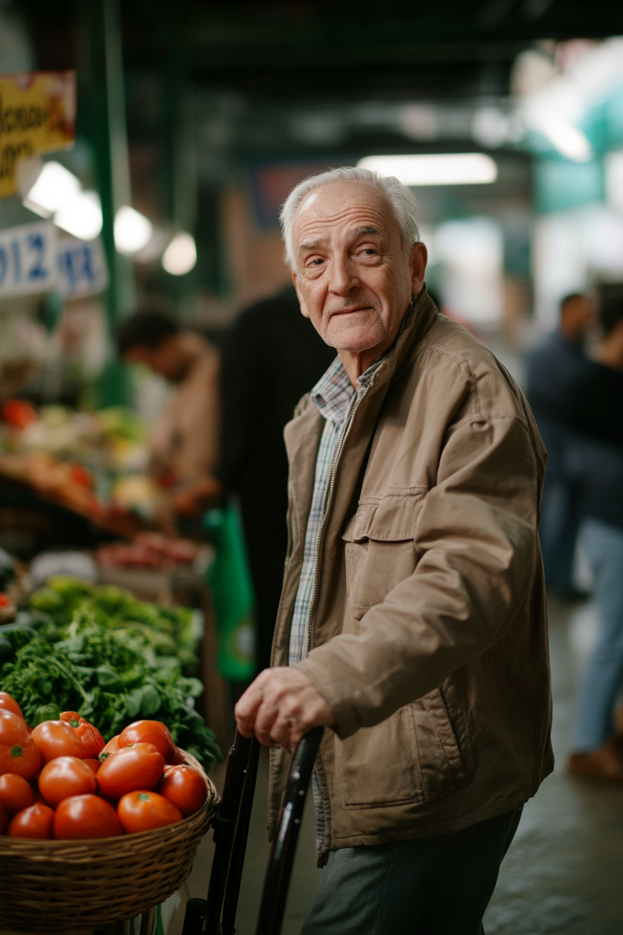 Azoka, gizon zaharra, tomateak, jaka, erosketak, barazkiak, fruituak, zorrotza, kolore bizikiak, ingurua harrigarria.