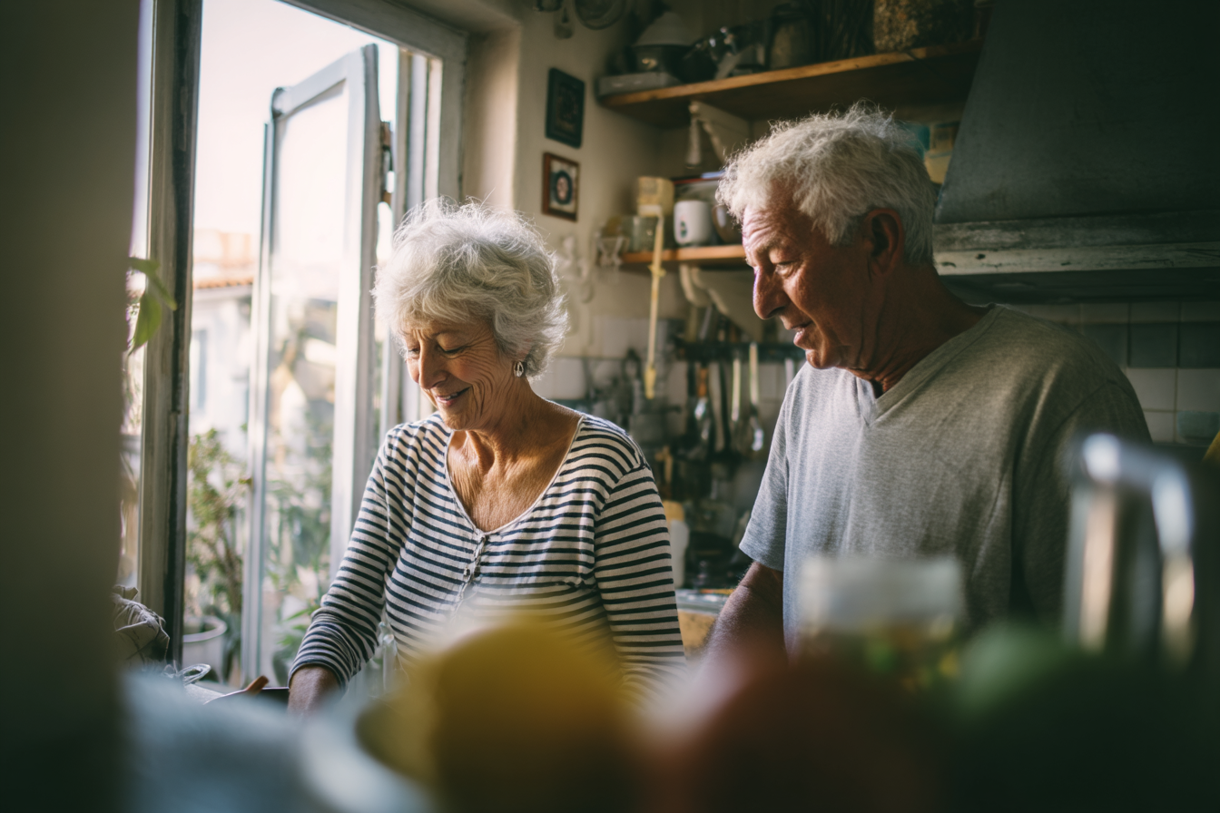 Irudia pertsona zahar bikote bat irudikatzen du, eguzki argiarekin argitutako sukalde batean. Emakumeak, ile zilar koloreko eta kizkuratua duena, marra-ziztenezko alkandora bat darama eta behera begira irribarre bat dauka, agian sukalde-ekintza batean zentratuta dagoela. Bere alboan, ile antzeko eta zilar koloreko gizon bat dago, gisako kamiseta grisa darama, arreta handiz begiratzen, elkarrekin elkarrekiko konplizitate eta zoriontasun atmosfera sortuz. Sukaldea, horma zuriak ditu, tresna eta ontzi ikusgarriek beteriko etxaldeak, bero eta etxearen sentimendu bat irudikatzen duena. Ateak irekiak daude, eguzkiaren argia sartzen uzten dutela, bitartean landare batzuk espazioa atsegin eta bizitza elkarrekin partekatua eta momentu sinpleak transmititzen dituzte.