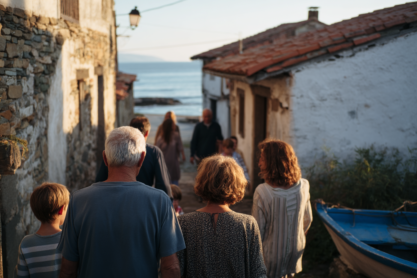 Irudiak une nostalgiko bat harrapatzen du kostaldeko ingurune batean. Pertsona-talde bat harri-piztutako bide baten bidez doa etxe estilo rustikoen artean, harrizko hormak eta teilatu-txapela dituzte. Ilunabarreko argi urreztatua eszenaren ingurura zabaltzen da, giro bero eta atsegina sortuz. Indibidualak, familiakoak direla dirudite, bizkarra dute, honek lotura intimo eta familiarra iradokitzen duelarik. Atzealdean kostaldea eta itsasoa ikusten dira, arrain-ontzi urdina hondartzan atseden hartzen. Taldeko adin aniztasunak, helduak eta haurrak barne, familia irteera edo ilunabarreko paseoa iradokitzen du. Giroa lasai eta lasai da, elkartasun eta natura gozamena inspiratzen duena.